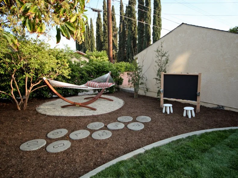 Going Yard’s Chris Lambton leaned into curvaceous details to give this open backyard’s new play area a sense of contemporary cohesion, where a modern hammock nestles among trees and tall shrubs planted for shade. A round tile hopscotch court and an outdoor chalkboard make this a great place for the whole family to relax.