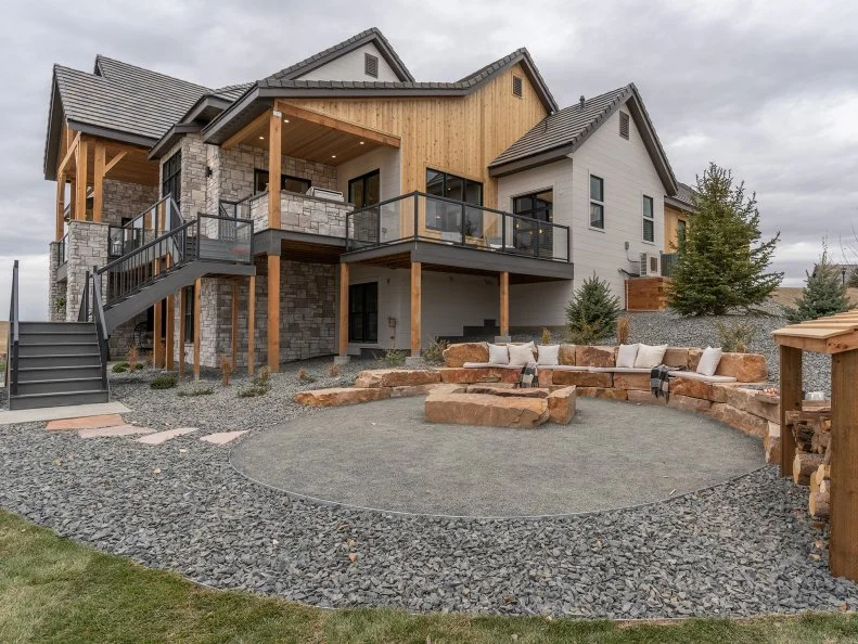 This design celebrates the natural landscape while optimizing functionality in a sloped space. Concentric circles of fine and rough gravel create structure, while a fire pit and tiered bench seating made with stone slabs provide both durability and visual appeal. This all weather setup is designed to withstand changing conditions while maintaining its beauty.